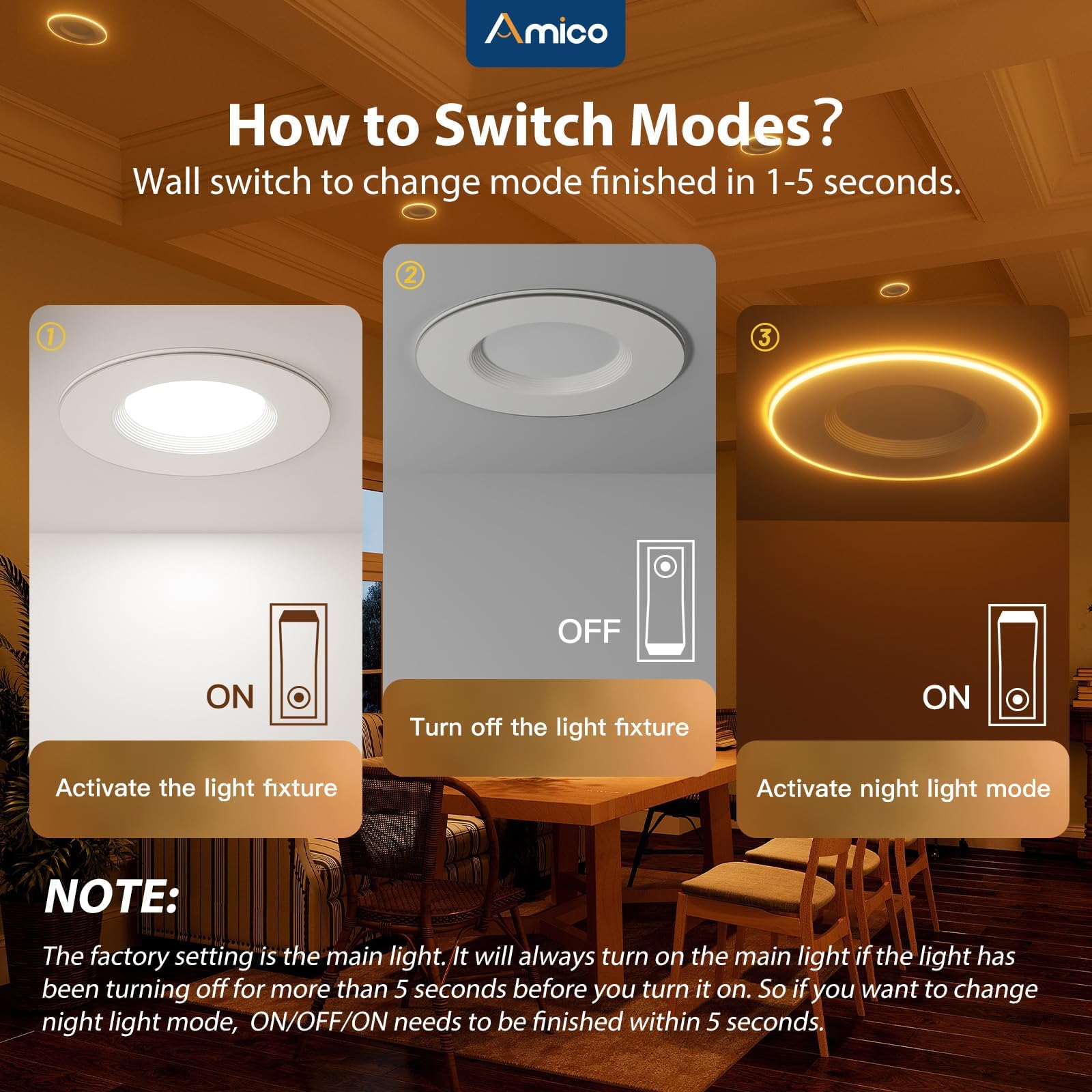 - Synchronization Reset Function: All of our led recessed can lights with night lights have a synchronization reset function, every time when you turn on the light, it will always be the main mode. Sometimes the lights get out of sync after installation. Please after turning off the light for five seconds, turn it on again, then the synchronization will be done.