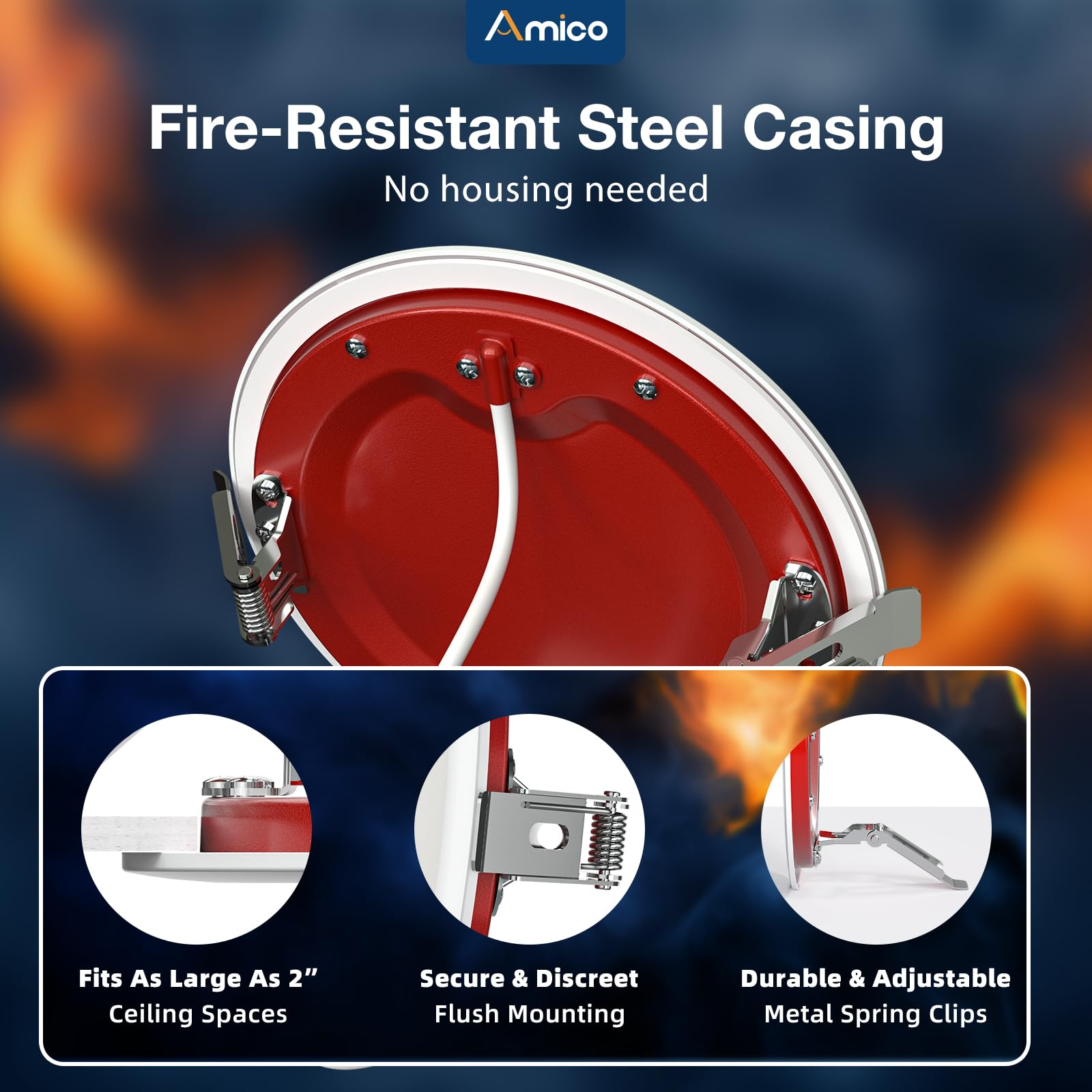 - Amico Benefits: Amico fire rated recessed downlights are damp-rated, offers fire-resistant lighting for bedrooms, living rooms, kitchens, hallways, and even bathrooms. Our recessed lighting are certified by ETL FCC Energy Star of a high standard.