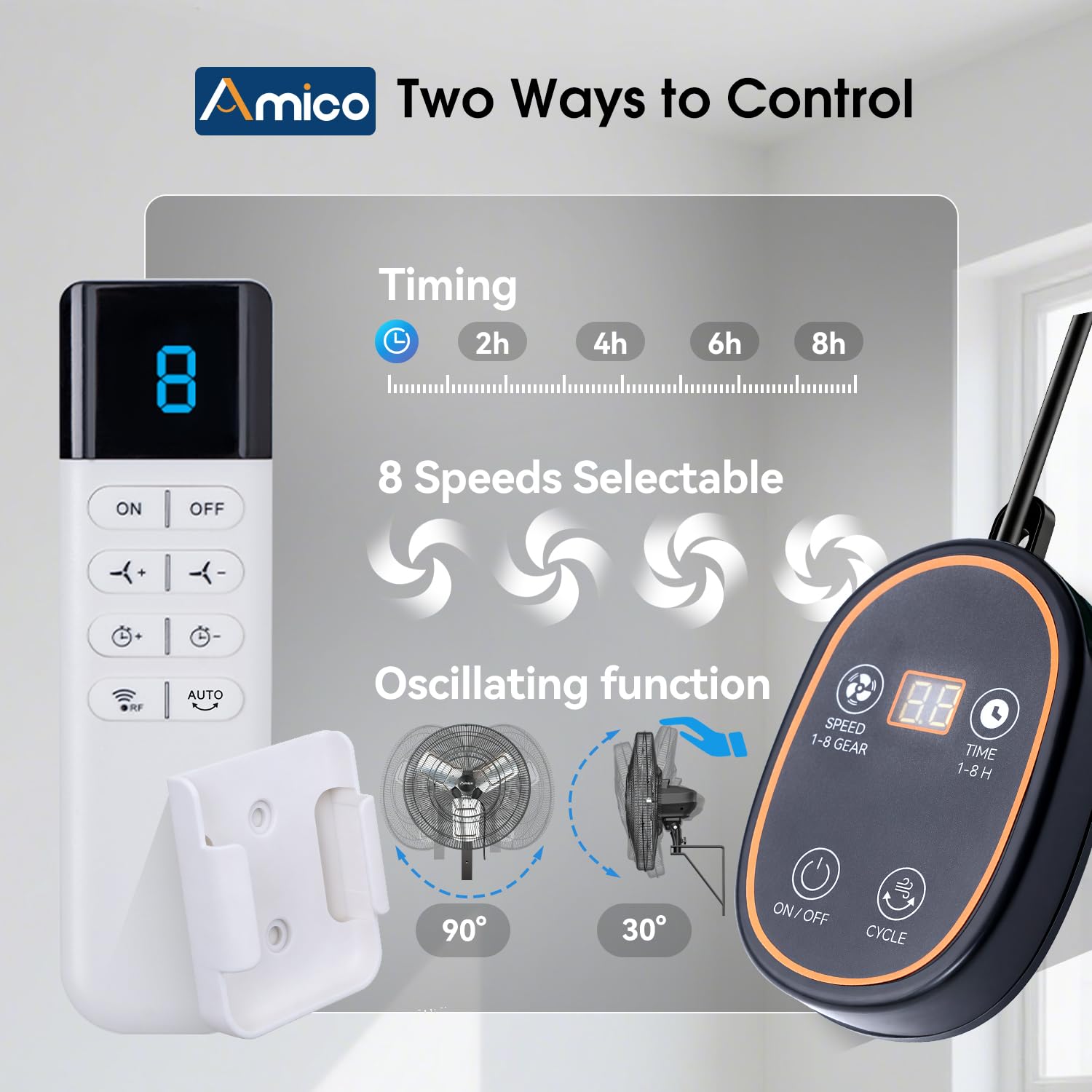 - Wall Mount Fan with Remote and Wired Control: Operate the fan easily using the remote control or the included wired controller. Adjust 8 speed levels, set a timer, or turn the fan on and off from a distance. Designed for dusty workshops and humid greenhouse spaces, this wall mounted oscillating fan with remote offers reliable control for both fixed and flexible installations.