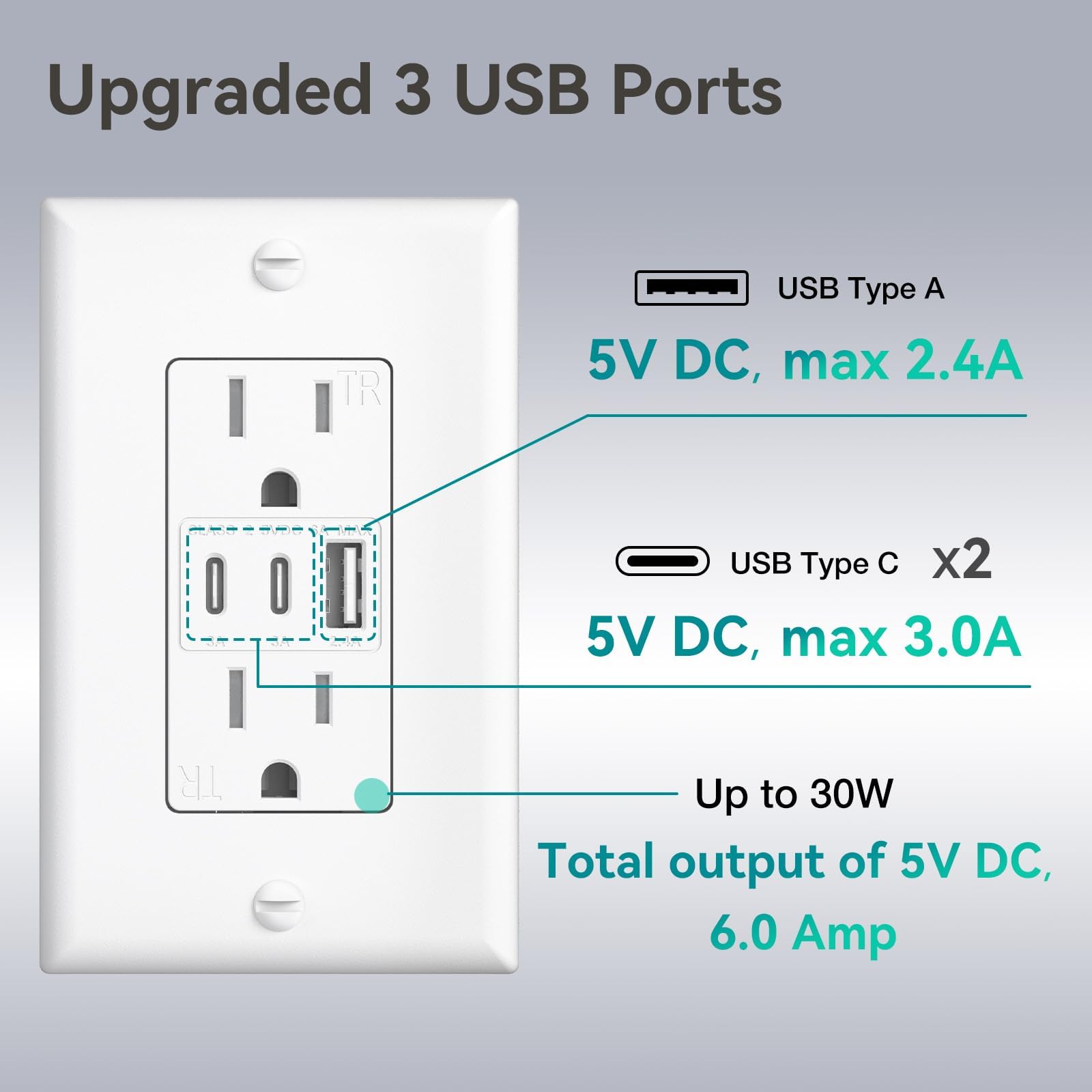 - High-Speed Charging: The USB ports deliver a combined output of 5V DC at 6.0 Amps, providing 30 Watts of power for fast and efficient charging, ensuring rapid charging for newer devices and high-demand gadgets.
