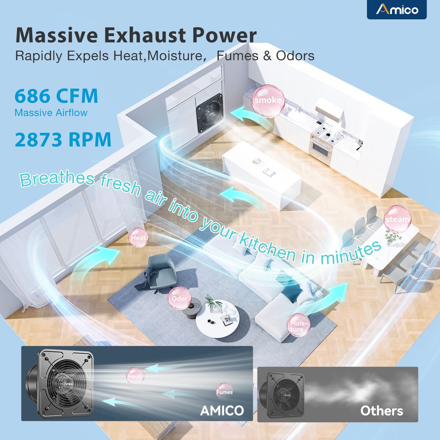 - 【Massive 686 CFM Exhaust Power】Powered by a high-speed 2873 RPM motor, this kitchen exhaust fan rapidly expels intense heat, moisture, thick smoke, and stubborn cooking odors. Instantly breathe fresh air into your home, making it the ultimate extractor fan for heavy-duty daily cooking.